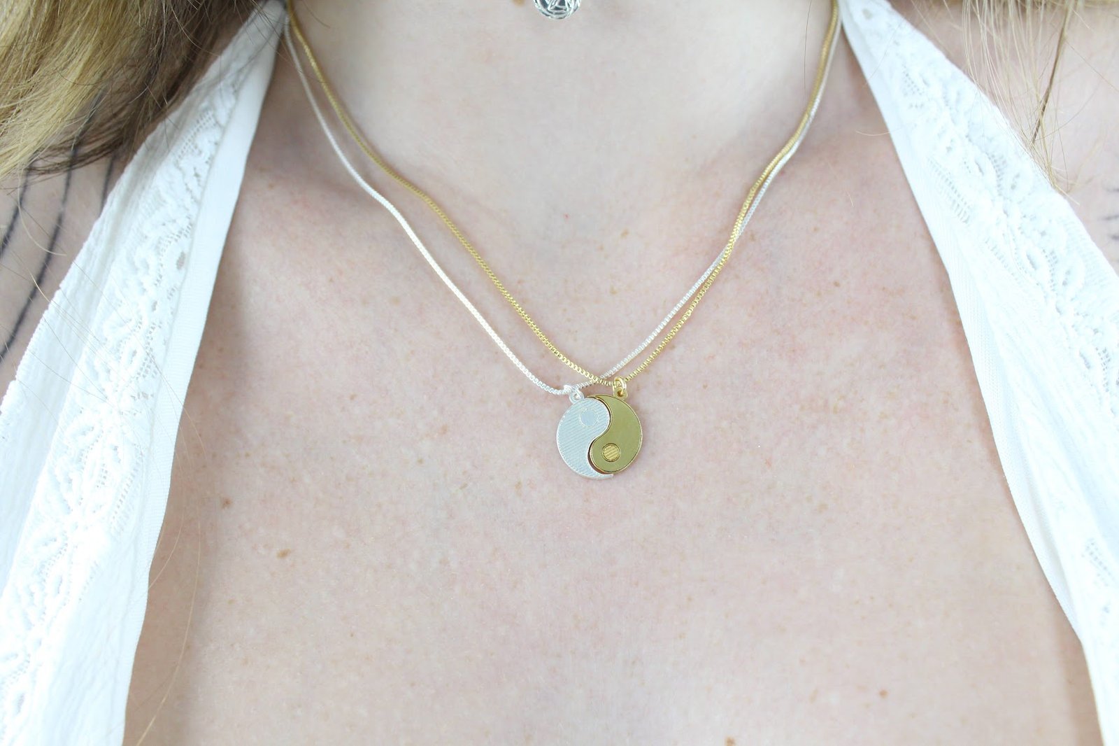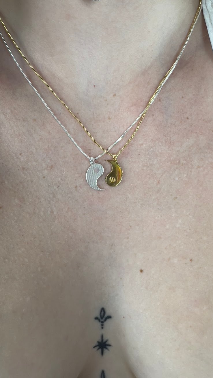 Uma releitura de um classico colar Cara Metade, com a combinação do YinYang. Perfeito para presentear quem você ama e carregar no peito esse sentimento incrível que temos uns aos outros. Podendo escolher o banho de cada metade, esse colar combina com qualquer look que você queira montar!